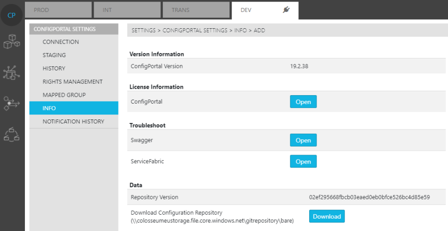 - Download Configuration Repository: Users are able to download the current configuration from the repository. This can later be uploaded to the desired Environment via Staging.