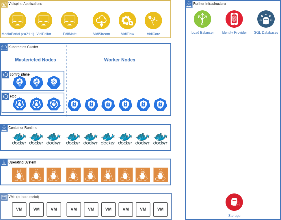 The following diagram shows the different infrastructure layers of an Enterprise MAM Solution on the left. It starts with virtual or bare-metal machines on the bottom on which further layers are installed: operating system, container runtime, and the Kubernetes cluster on top.