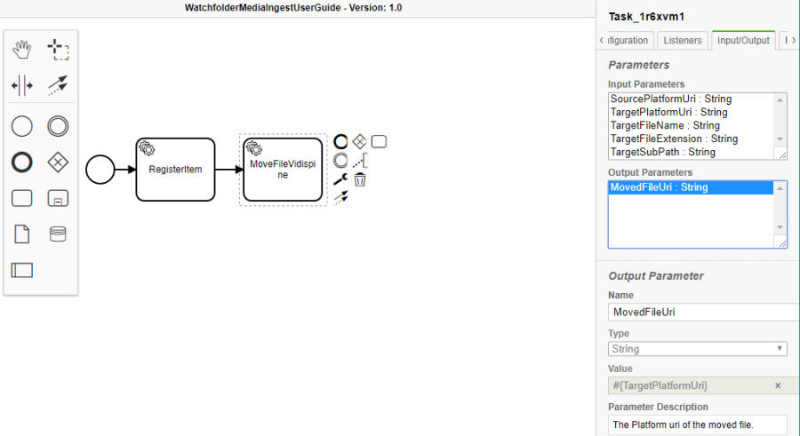 Another visible global parameter is the "TargetPlatformUri", which was introduced by the "MoveFileVidispine" task. Selecting that task again one is able to rename this output parameter, e.g. to "MovedFileUri". The task will pass the abstract Uri of the new file (represented by a new file Id) to this parameter. One might ask oneself why there is a new file and file Id for the moved file.