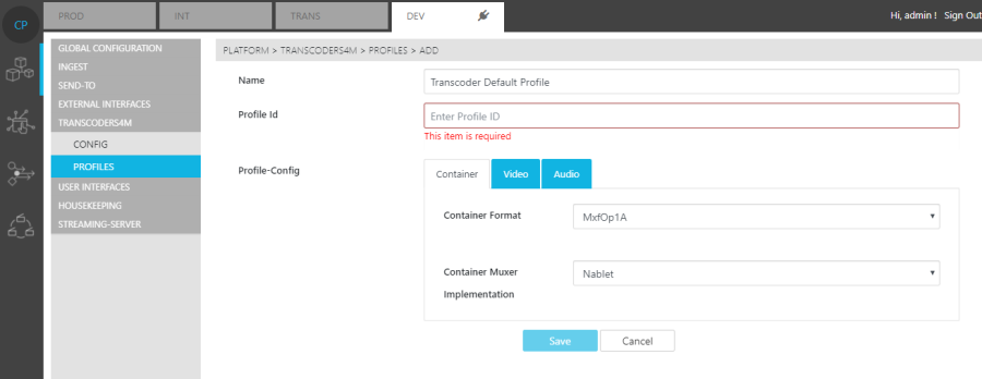Apart from being able to enter the profile name, and specify the profile´s ID, users are able to configure Container, Video and Audio settings in each of the respective tabs.