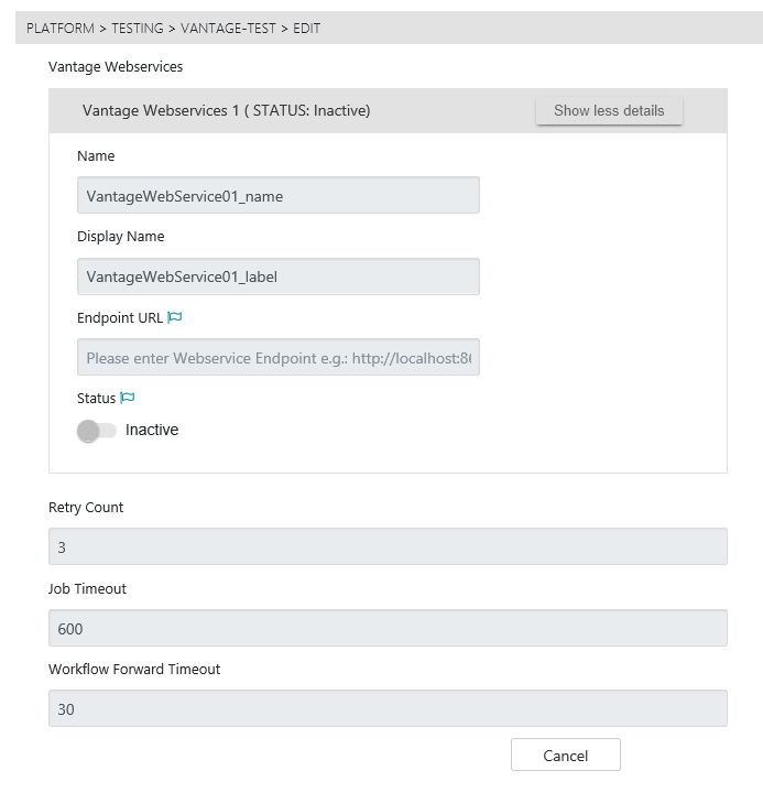 - Job Timeout: sets the maximum amount of time tolerance (in seconds) in which no status is returned from the Vantage API. If a status is not returned within that time limit, it will be considered as "failed".