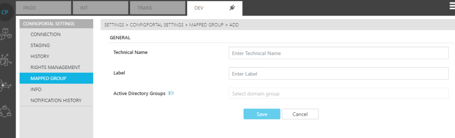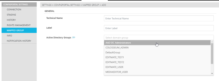 For every mapped group a technical name must be entered which cannot be modified once the group is created. Labels on the other hand can be changed and are used to identify groups in ConfigPortal. The Active Directory Groups field offers a dropdown containing all the AD groups which can be mapped.