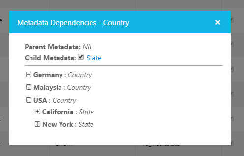 By clicking on the hyperlinked field, users can then be redirected to the field and any particular dependencies that field may have. As expected, the Parent Metadata for "State" is "Country".
