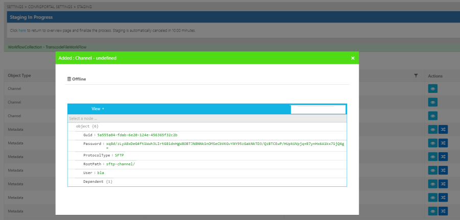Clicking on the "Eye" icon will prompt a change window offering a before and after representation of the changes. The "Offline" table encompasses all of the change contained in the uploaded configuration file, those changes the user intends to effectuate. If a change is classified as "Added", as is the case with the example below, then there are no current configurations. Hence, no "Online" version of the configuration change.