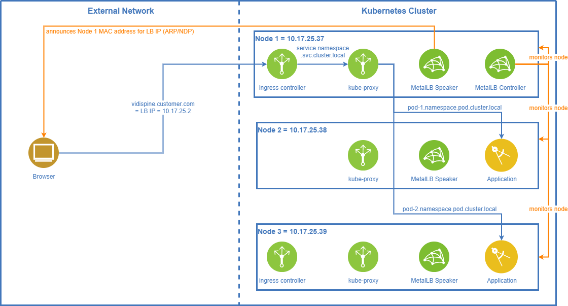 In layer-2 mode a virtual load balancer IP needs to be defined. The hostname of your application (https://vidispine.customer.com in the diagram) needs to resolve to this virtual IP.