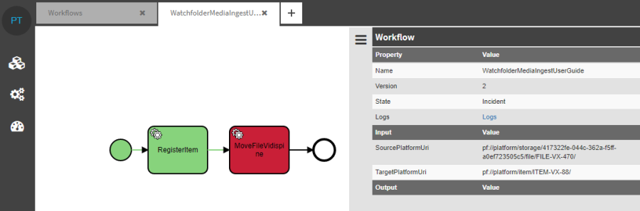 The workflow will appear as depicted below, marking the "MoveFileVidispine" element as red. This indicates that the workflow has failed.