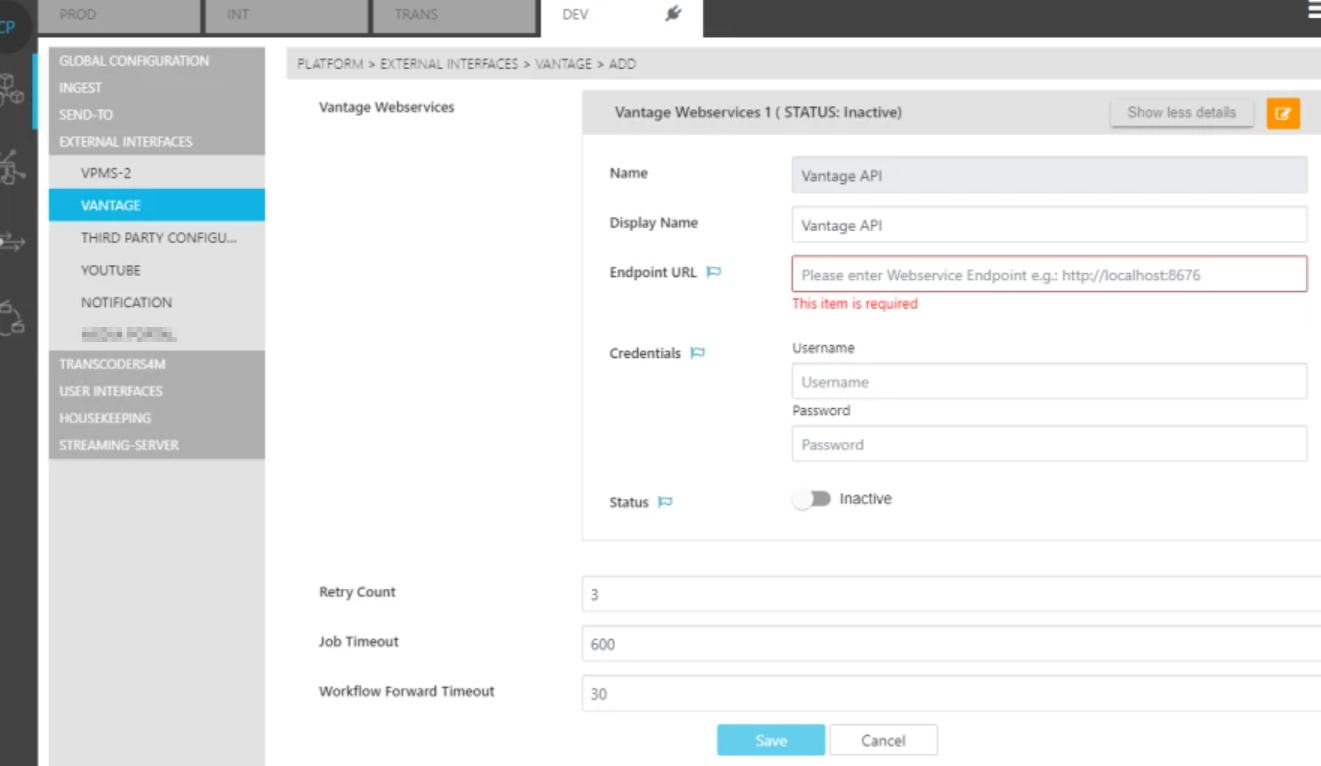 Another option within the range of External Interfaces is the possibility of integrating transcoding solutions. One of these transcoding solutions is Vantage.