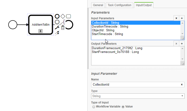 Once the workflow is selected, you can specify its in- and output parameters the same way as you can do for Service Tasks.