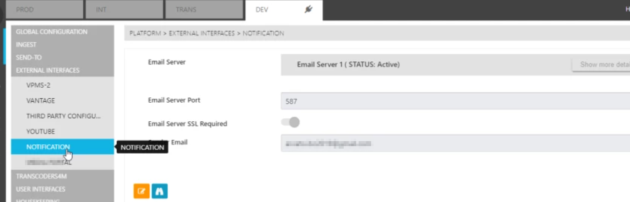 The Notification Page is contains the current configuration for the email server. This is required for VidiFlow agents which include tasks in which emails are sent as notifications.