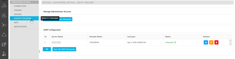The Identity Provider Page is where a ConfigPortal specifies connection between ConfigPortal and the LDAP connection to the intended system's Active Directory, domain and group management. It is also from this Page that one is able to assign roles containing rights (defined by Vidispine) to existing groups.