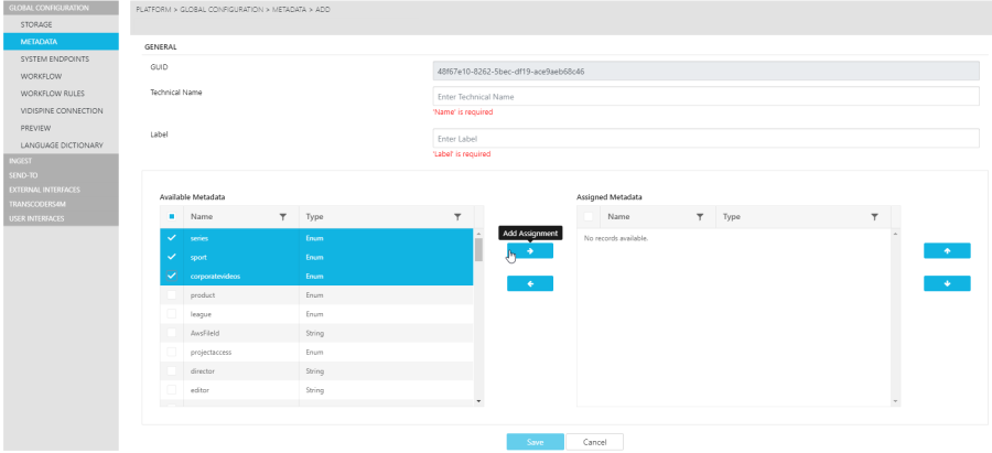 In addition to single field creation, ConfigPortal allows for the creation and editing of metadata field groups. A named metadata group can be created in which any available metadata fields can be selected (checked) and then added to the group. These metadata must already be available in the repository. These might be metadata that are synched as standard system metadata from Vidispine or custom metadata fields created via ConfigPortal.
