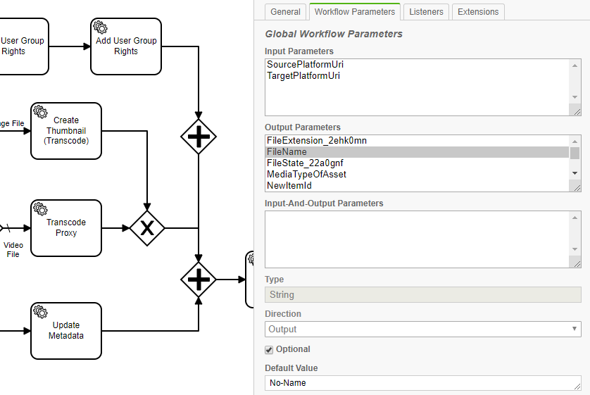 Previous to VidiFlow 20.1, all workflow output parameters were always handled as mandatory output parameters. Meaning that those parameters should have a value assigned inside a workflow. This especially caused problems in usage of sub workflows.