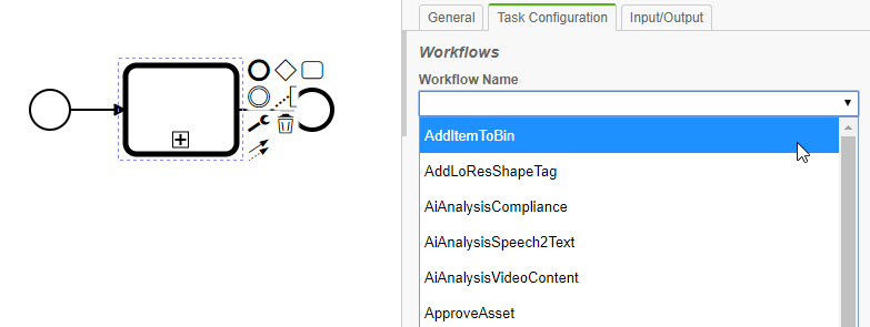 In the "Task Configuration" tab one can then select any of the existing workflows to be triggered by the Call Activity.