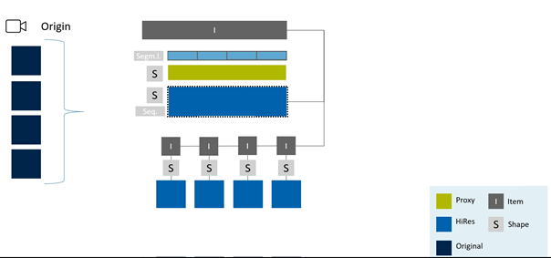 As both the sequence and the rendered file contain the same visible information this is consistent with VidiCore’s data model. A continuous proxy video spanning all clips is possible and can be rendered directly from the item sequence. Rendering of the continuous hires clips and the proxy video is possible in a single VidiCore transcode job.