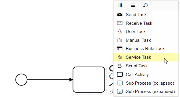 A menu will be prompted in which different types for that element can be selected. Select the "Service Task" option from the menu.