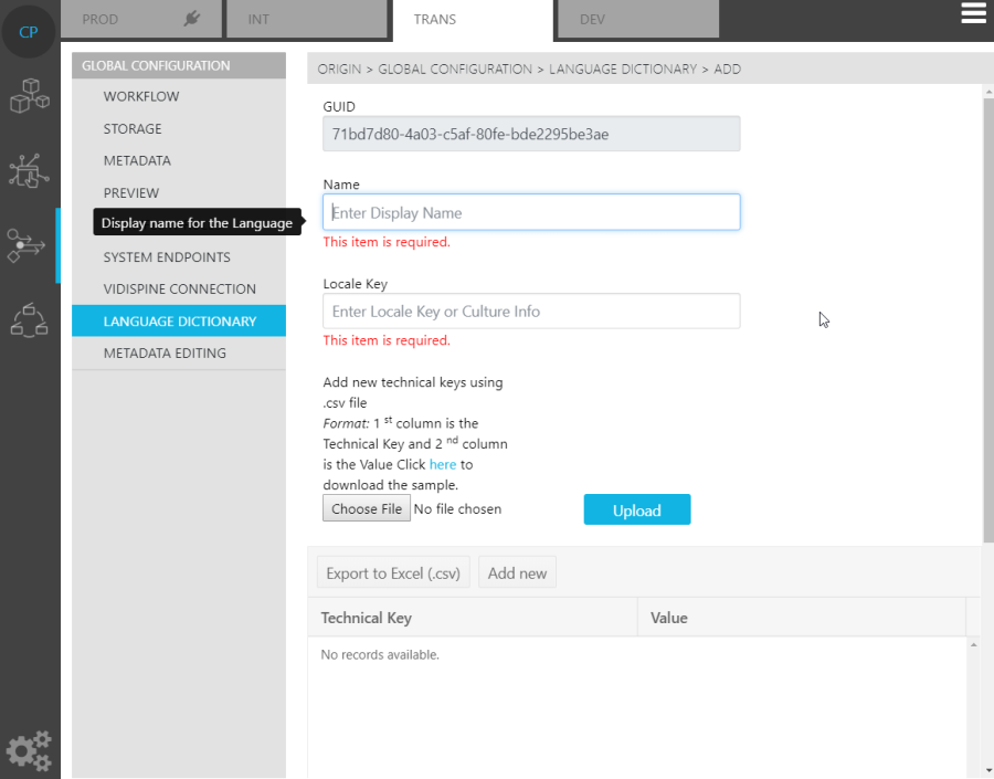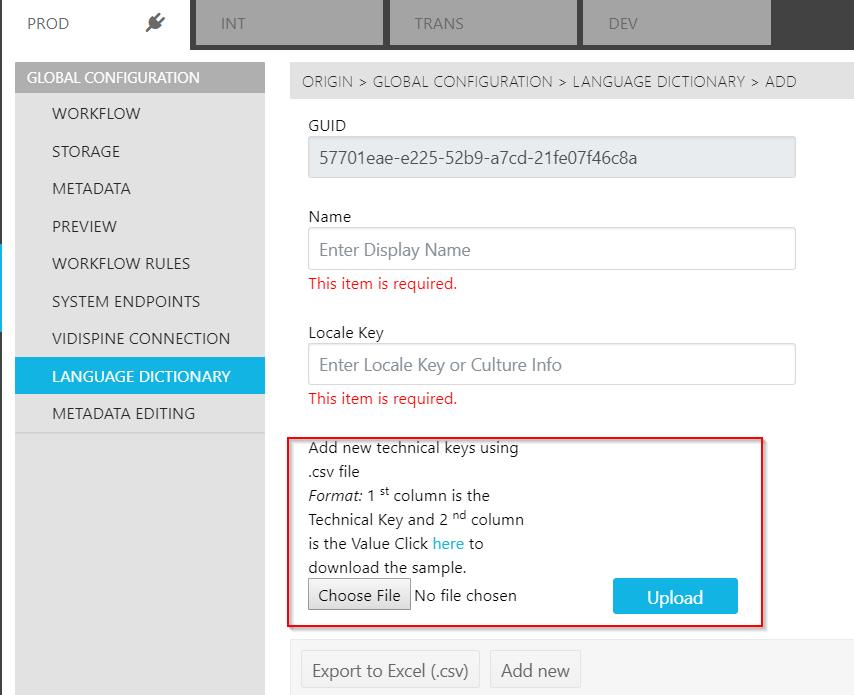 Once the language entry has been made into ConfigPortal, users can then upload a list of technical keys and their corresponding values. This can be done via a .csv file (with a template directly available from the Page).