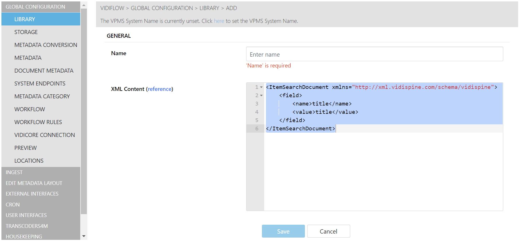 To support libraries in VidiFlow, a new configuration option was built into ConfigPortal under the Global Configuration \ Library page, where name and search pattern for each library can be entered. The GUID shown in CP will also be used as external ID for the library. IDs of libraries are now also supported as PlatformURI with the sub type Library.