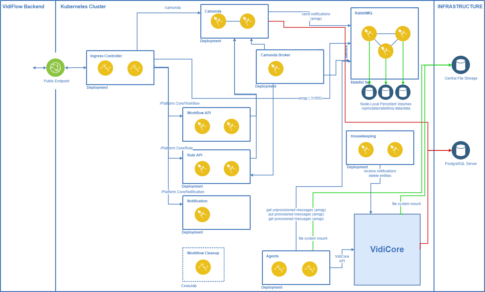 These diagrams show how VidiFlow is deployed to a Kubernetes cluster. The first diagram focusses on backend components and APIs. The second one on user interfaces provided by VidiFlow.