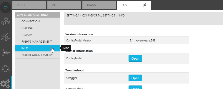 The user must open the Info page under the ConfigPortal Settings Module and click the "Download" button for the Download Configuration Repository option. This triggers a download for a configuration repository (GIT) ZIP file that is saved locally.