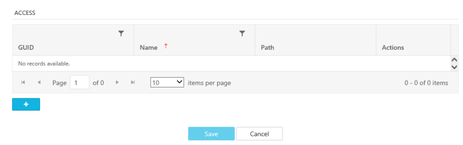 Accesses attributed to a storage visible right below the storage's general section. Users creating a storage must then specify or create an Access. A single storage may make use of multiple accesses so as to allow for different combinations (such as the access types). Clicking on the "Plus" button will redirect the user to the "Add Access" Page.