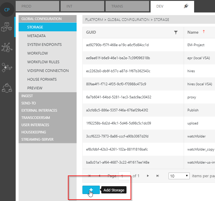 Unlike Functional Use Case Pages, which allow one to select available storages, the Global Configuration Storage Page allows one to modify available storages as well as delete and create new ones.