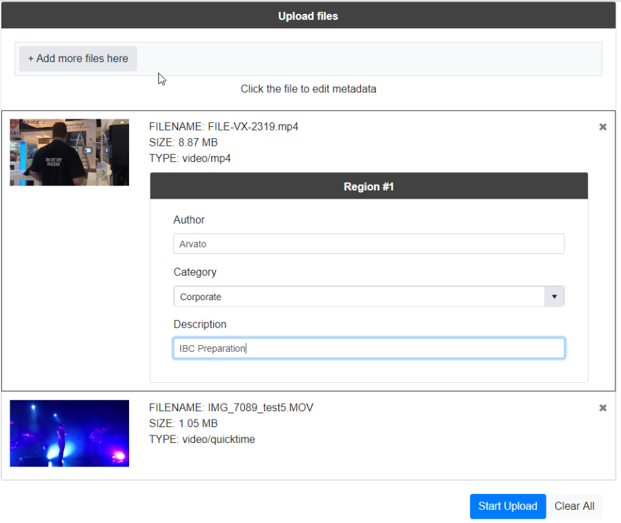 One can add one or more files via drag and drop or opening a file dialog. Each file is represented by an icon or thumbnail and some additional information. Selecting a file allows one to edit the metadata fields which have been configured in ConfigPortal.