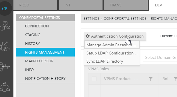 For ConfigPortal users attempting to manage rights for the first time, certain steps must be taken before groups may be identified to which roles are assigned. One must first establish an LDAP connection.