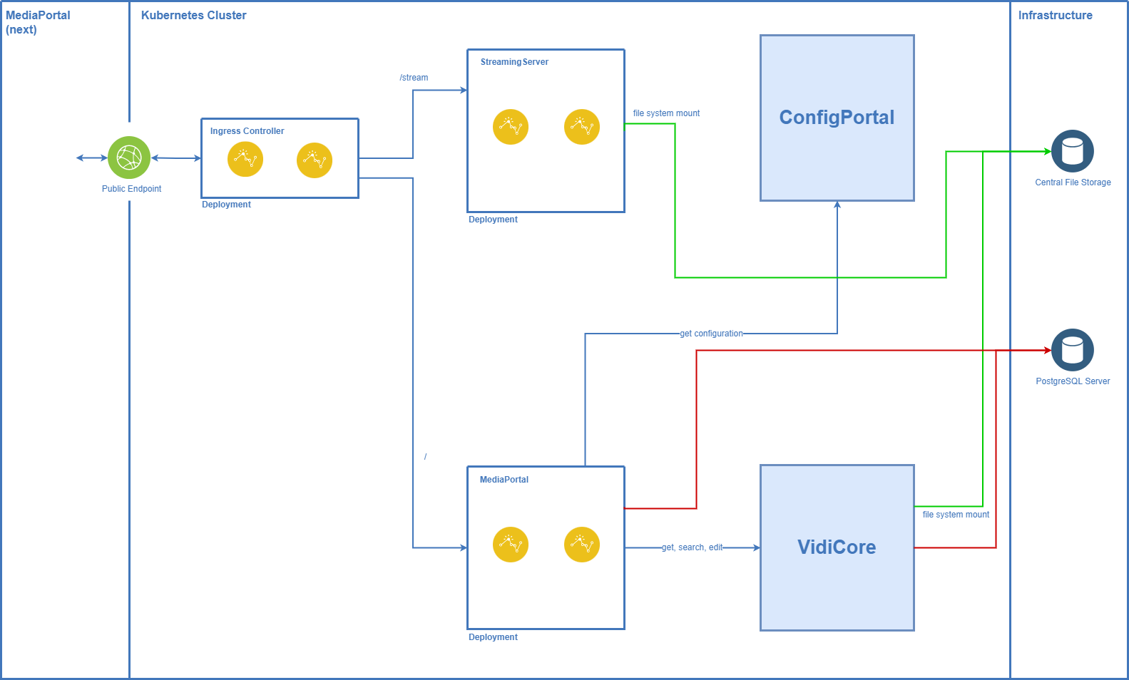 This diagram shows how MediaPortal (version 21.1 and newer) is deployed to a Kubernetes cluster.
