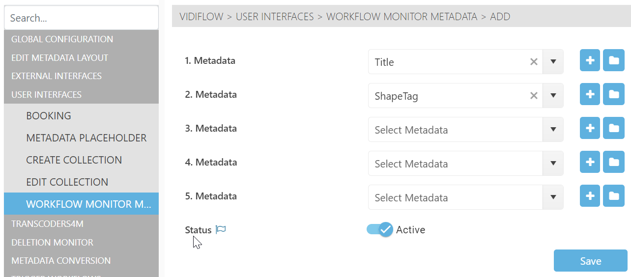 It is possible to configure up to 5 metadata columns to be shown in the main view for the VidiFlow Monitor. These are loaded from VidiCore through a VidiFlow backend service.