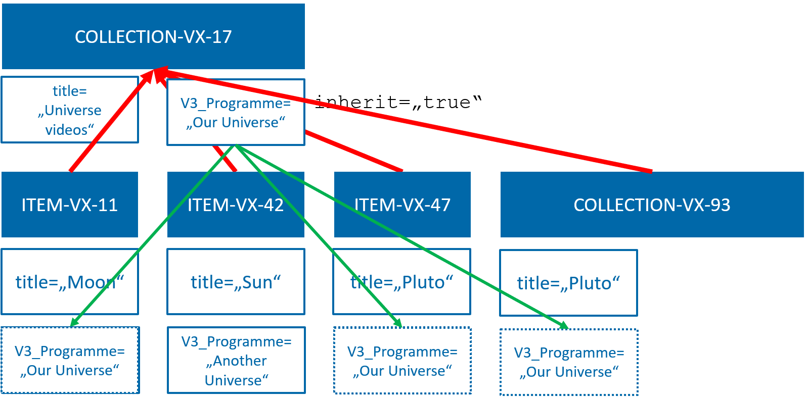 Inheritance can be broken by setting a field value directly on an item or a sub-collection. If you set the the V3_Programme field on ITEM-VX-42 to Another Universe explicitly the value Our Universe originally inherited from COLLECTION-VX-17 will not be available on ITEM-VX-42 any more: