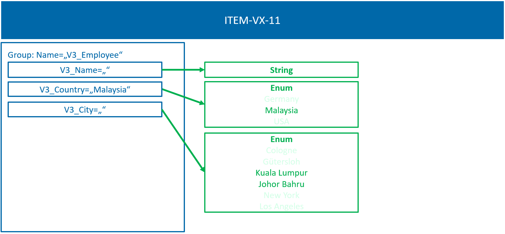 Let’s assume our system has configured the enums V3_Country and V3_City. Both have their possible set of values: