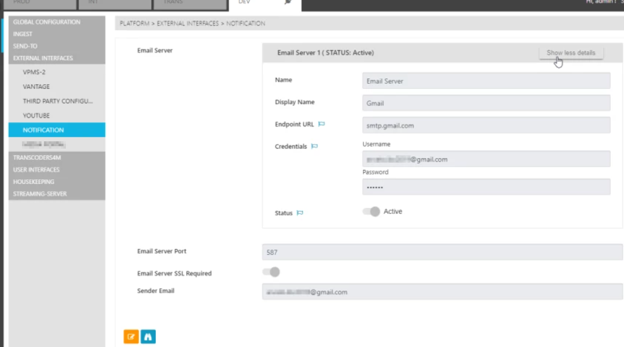 The Notification Page is contains the current configuration for the email server. This is required for VidiFlow agents which include tasks in which emails are sent as notifications.