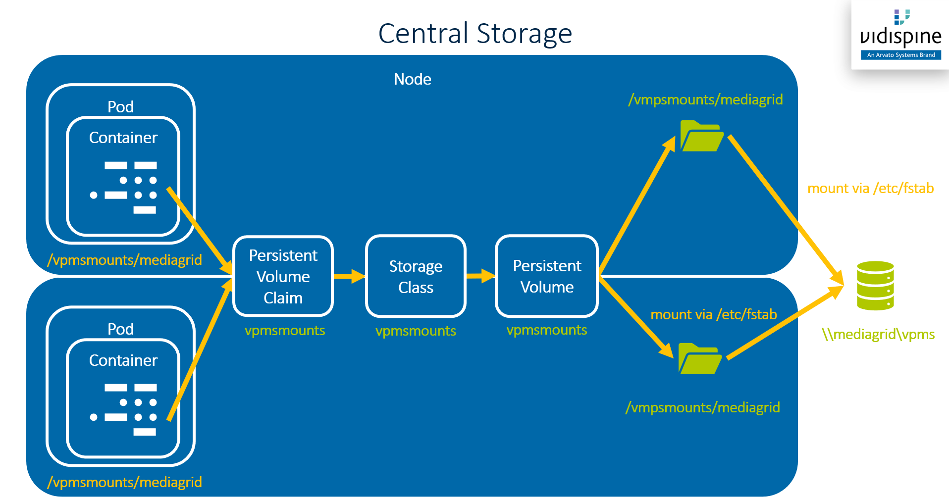 The follow diagram shows the asset storage is mounted into pods which require access to it (e.g. VidiCore or VSA). The network location \\mediagrid\vpms is just an example - any network location which can be mounted to the Linux file system of the cluster nodes can be used.