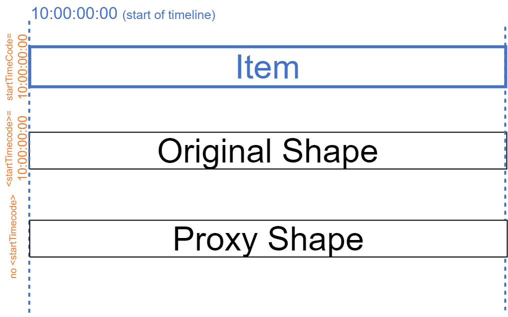 When display time codes (and durations) in user interfaces it usually is not only sufficient but also advisable to use time code and duration information from the item. As all shapes on an item must refer to a representation of the same visual content, all shapes must start at the same position. Please note that the same position on the timeline may be expressed in different time bases.