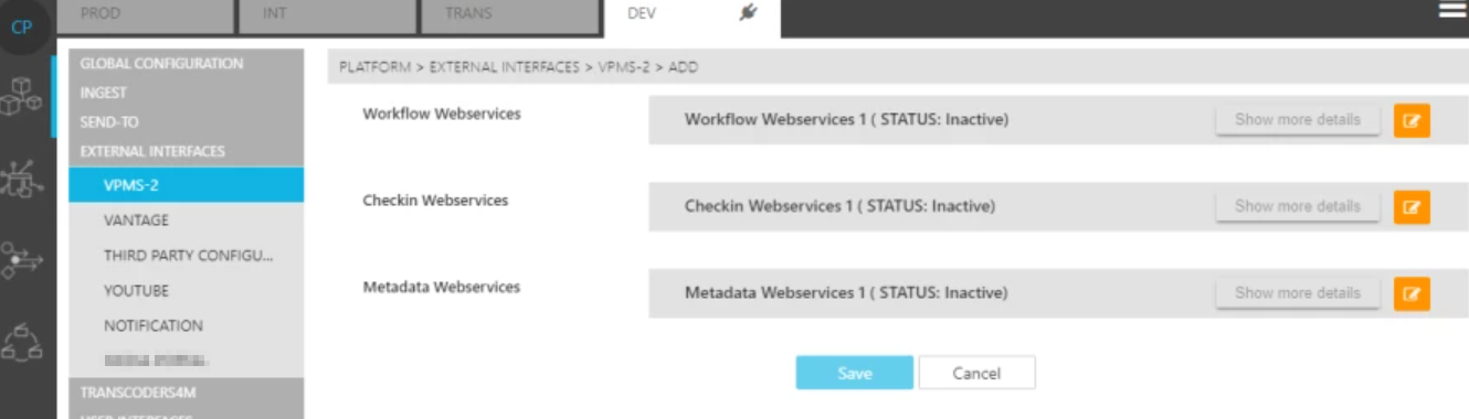 The VPMS-2 External Interfaces configuration set displays a series of web services responsible for connecting VidiFlow to VPMS-2. Clicking on the "Show more details" button next to each web service will display a detailed view of each web service's configuration options.