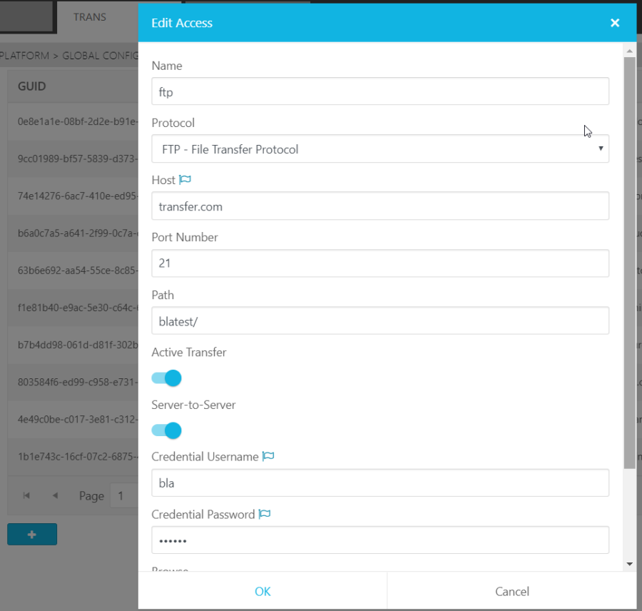 The example below illustrates an example in which the name and protocol of a storage access are marked as not Staging dependent while parameters like hostname, username and password are handled as Staging d dependent.