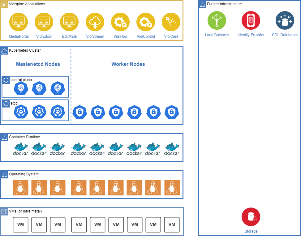 The following diagram shows the different infrastructure layers of an on-prem/hybrid/BYOC MAM solution on the left. It starts with virtual or bare-metal machines on the bottom on which further layers are installed: operating system, container runtime, and the Kubernetes cluster on top.