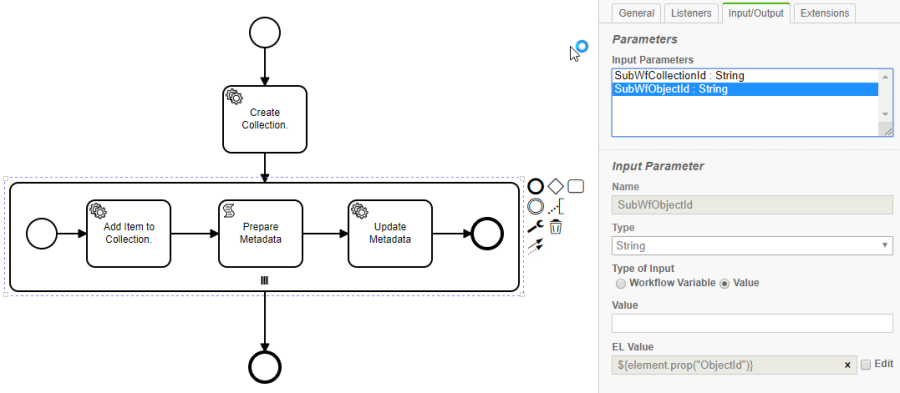 - As input for the "SubWfObjectId" parameter, the iterated element variable is used once again: