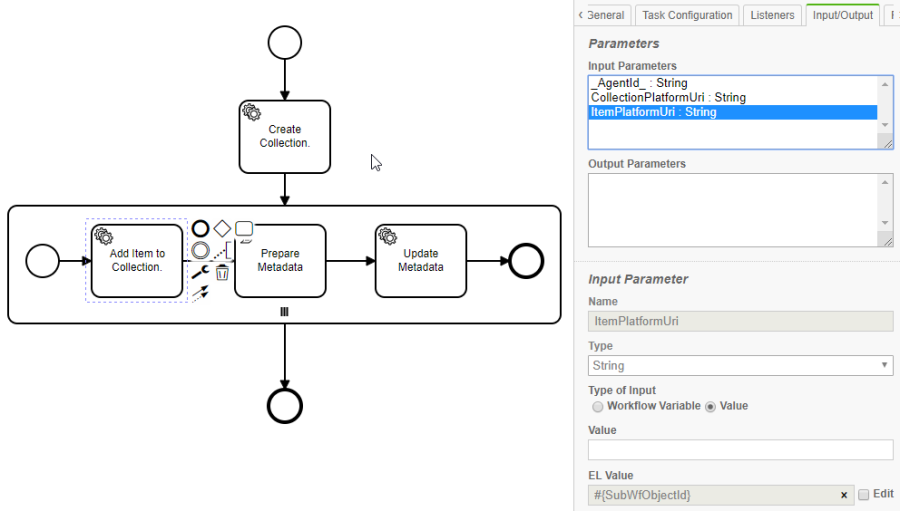 - Firstly, one assigns a workflow parameter called "SubWfCollectionId" to the "CollectionPlatformUri" input parameter: