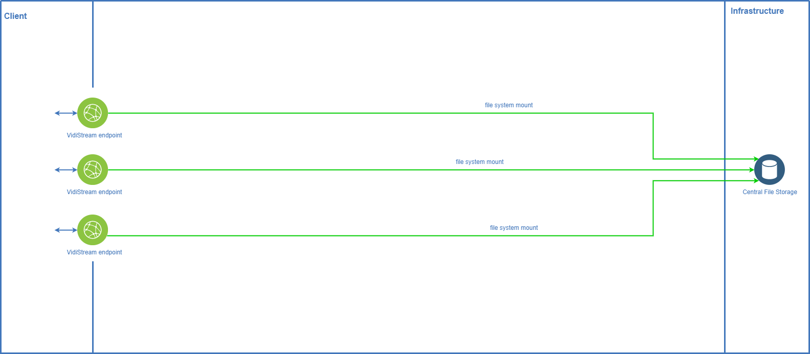 When looking at the aspect of load balancing on the highest level there may exist any number of VidiStream instances which have access to the same set of arbitrary storages. Client requests for streaming are then directed to one VidiStream instance which in turn retrieves the requested file(s) and delivers the content.