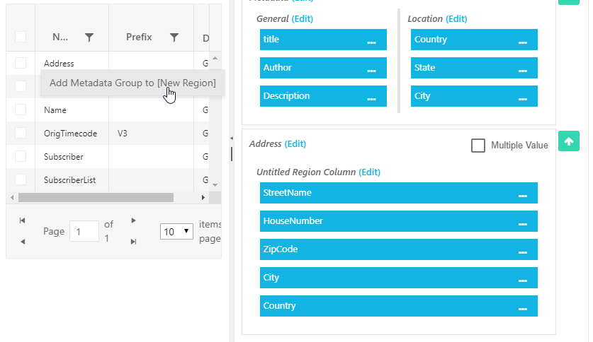 It is important to note that when adding a metadata group, a new region will always be created. This region will automatically be populated by all the group's fields. This is illustrated in the example below, in which the metadata group "Address" was added along with the group's fields.