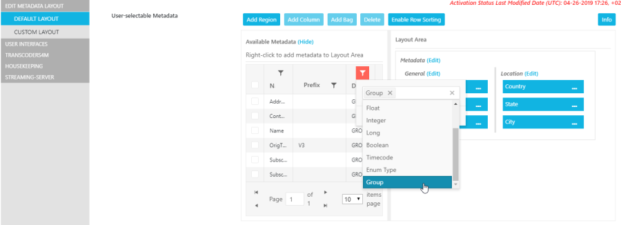 Metadata groups can also be used in the Edit Metadata Layout Page. By selecting the "Group" Data Type option, users can search for different groups by using the filters.