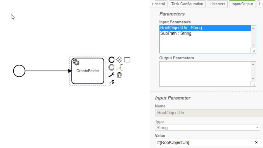 Having selected the "CreateFolder" Service Agent will update the Task element accordingly. Depending on the selected Service Agent, the input parameters for a workflow may differ. The necessary input parameters can be found under the Input/Output Tab in the Properties and Executions Menu. In this case, users must define the RootObjectUri and any intended SubPaths.