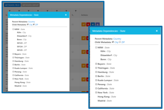 Datasets (dependent enums) also support the definition of multiple child-dependencies. Under Metadata Field, users are able to set several metadata fields as dependent to a parent field.