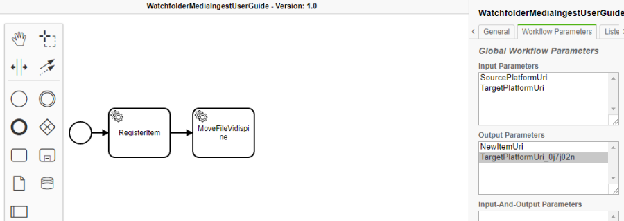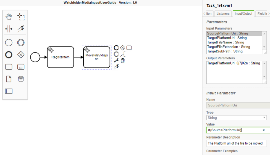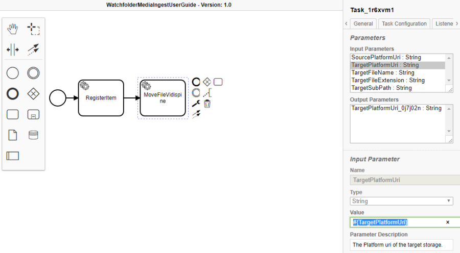 Another visible global parameter is the "TargetPlatformUri", which was introduced by the "MoveFileVidispine" task. Selecting that task again one is able to rename this output parameter, e.g. to "MovedFileUri". The task will pass the abstract Uri of the new file (represented by a new file Id) to this parameter. One might ask oneself why there is a new file and file Id for the moved file.