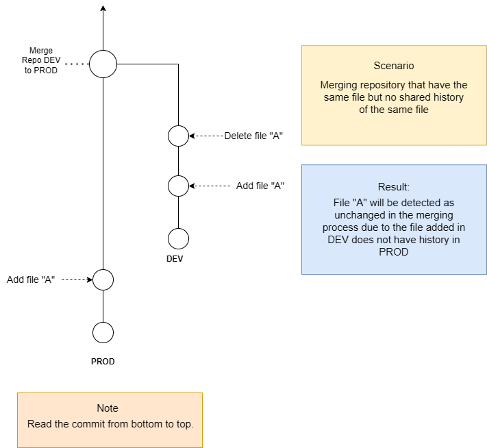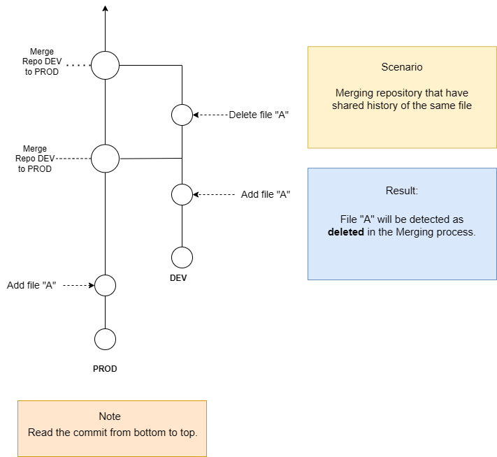 However, it is important to note that using partial merge does not merge the entire history of the source repository into the target repository. This means that if both environments contain the same data with different values, the subsequence staging action for that data may be overwritten or ignored from the source repository if there is no common commit history of same file detected.