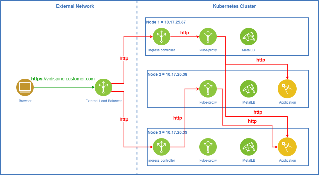 The default product setup for Vidispine on-prem/hybrid/BYOC MAM is to do TLS termination on the ingress controllers. When using MetalLB in layer-2 mode this is the preferred way to go.
