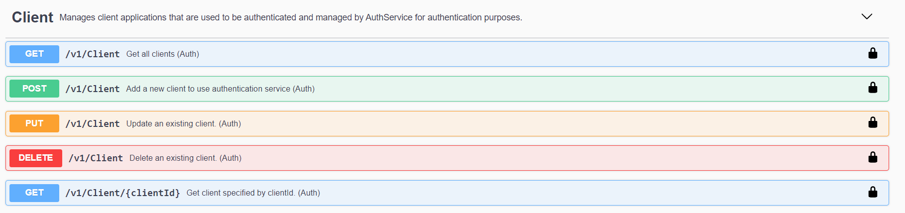The /Client API allows admins to register all client applications to be managed by the AuthService for authentication and authorization purposes.