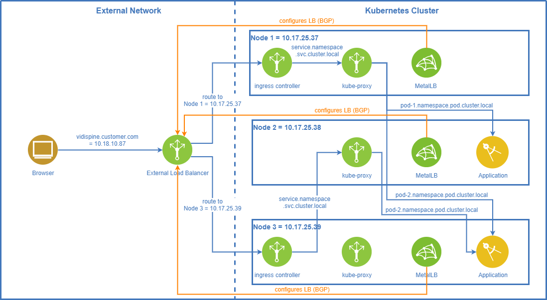 In layer-2 mode a virtual load balancer IP needs to be defined. The hostname of your application (https://vidispine.customer.com in the diagram) needs to resolve to this virtual IP.