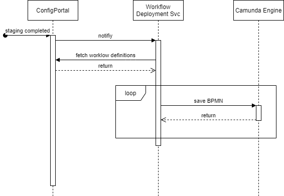 When a new workflow is not created or modified via the Workflow Designer, the new BPMN definitions or their updates will not end up in Camunda directly. Therefore, ConfigPortal is sending a notification to the Workflow Deployment service via the RabbitMQ Message Bus. The Workflow Deployment service will fetch all workflow contracts and BPMN definitions from ConfigPortal and applies all changes to the Camunda engine. This will ensure that all BPMN workflows deployed to Camunda are in sync with ConfigPortal.